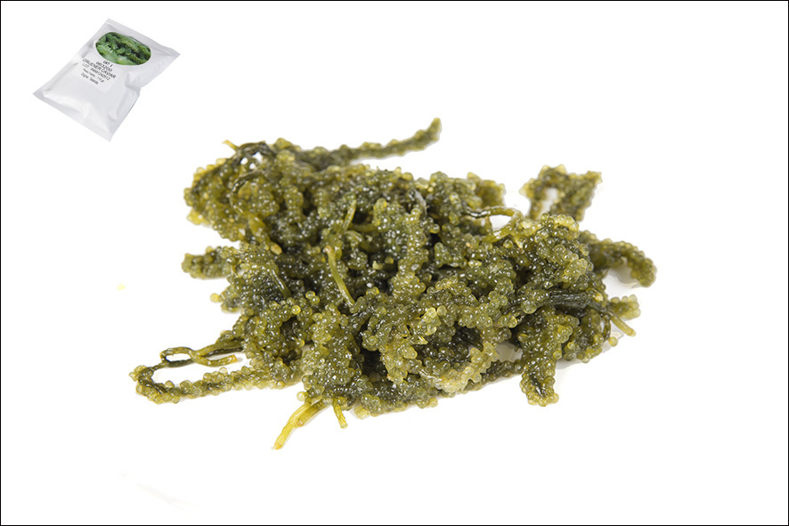 Umibudo wird auch Grüner Kaviar oder Meerestraube genannt und gehört zur Familie der Seegräser. Im Mund platzen die Kügelchen auf, wobei sich der Geschmack des Meeres auf der ganzen Zunge verteilt. Umibudo wird roh verzehrt, als Snack oder in Salaten. Vor der Verwendung, das Produkt 3 Mal in Wasser einweichen.