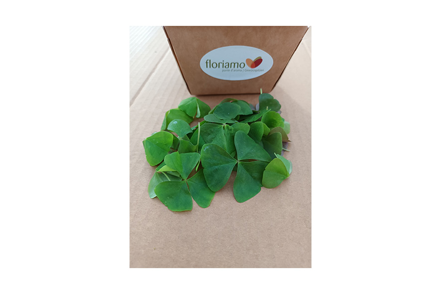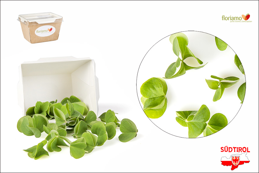 Großblättriger grüner Klee, mindestens 30 Stück pro Schale. Sie haben einen betont säuerlichen Geschmack. Servieren sie eine Ofenkartoffel mit Oxalisquark in Kombination mit Kerbel, Schnittlauch oder Petersilie.