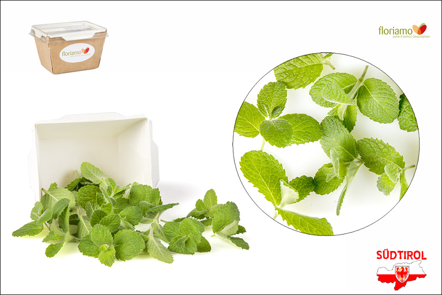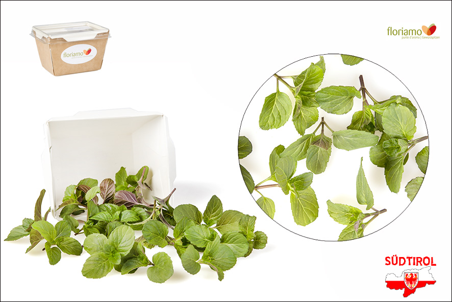 Apfel Minze Spitzen, mindestens 40 Stück pro Schale. Auf Grund des geringeren Mentholgehalts ist die Apfelminze lieblicher und milder als andere Minzen. Speziell gut zu gebrauchen in Dessert oder Salaten, überall wo man etwas fruchtige Säure hinzufügen will. Oder auch für den Drink "Hugo".