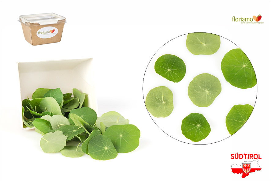 Blätter von Nasturzium (Kapuziner), mindestens 40 Stück pro Schale. Zum dekorieren, verzieren und verfeinern von Gerichten. Ihr würziger Geschmack eignet sich hervorragend in allen erfrischenden Gerichten und lässt sich besonders gut mit Ravioli, Schafskäse oder Makrele kombinieren.