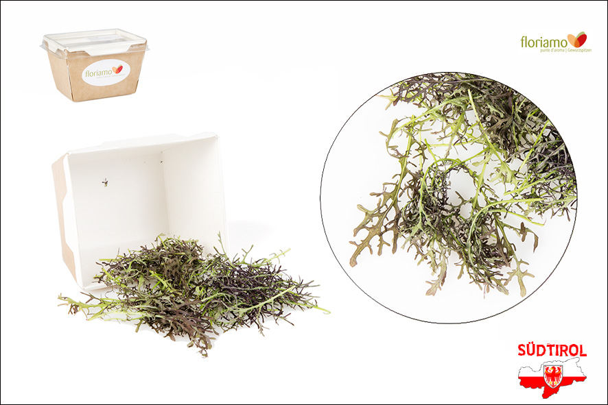 Rote gefranste Senfblätter, mindestens 50 Stück pro Schale. Zum dekorieren, verzieren und verfeinern von Gerichten. Die rot/grünen Blätter sind nicht nur schön anzusehen, sondern werden auch als Salatbeigabe genutzt.