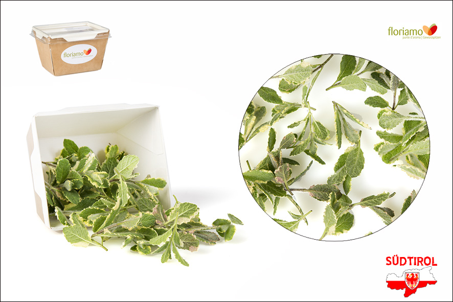 Spitzen von Ananasminze, mindestens 40 Stück pro Schale. Zum dekorieren, verzieren und verfeinern. Sehr dekorative panaschierte Blätter, grün mit cremig gelben Rändern. Der Geschmack und Duft erinnert an Ananas. Verwendungstipp: Minz-Gelee, Tee, als Würze zu Fleisch, Reisgerichte, Salatmarinaden, usw.