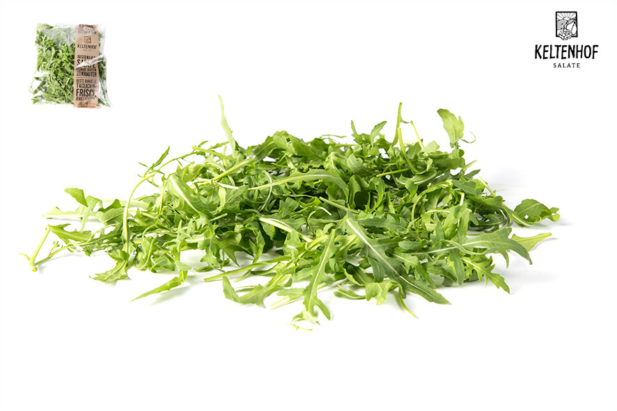 Küchenfertige Rucola oder Ölrauke. Sie wird ohne Chlor als Waschzusatz gewaschen. Keltenhof erntet sie erheblich früher als sie üblicherweise auf den Markt kommt. Ihre kleinen Blättchen verfügen über einen besonders feinen, würzig-nussigen Geschmack. Rucola schmeckt genial in einem italienischen Salat mit Radicchio und grünen Tomaten oder als Pesto.