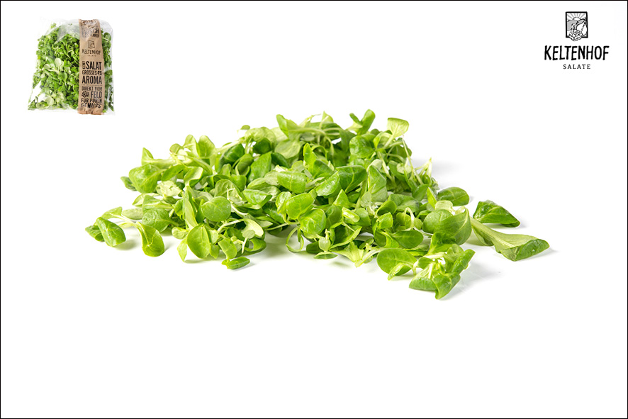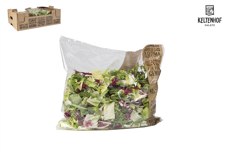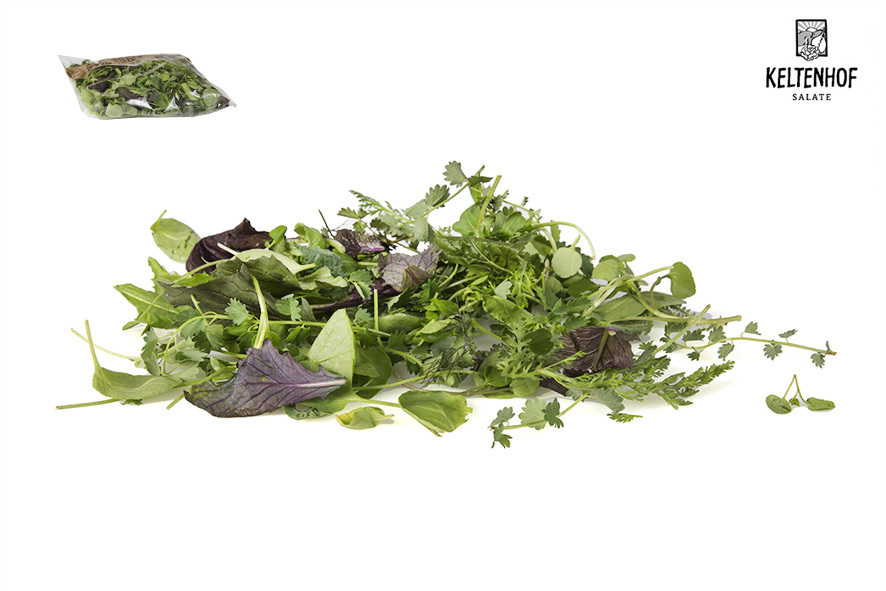 Frischer Mischsalat bestehend aus: jungem Feldsalat, Baby Spinat, feiner Frisee, Radicchio und Batavia rot. Innovativer Geschmack durch selektierte Mischung. Starkes Volumen durch Stabilität der einzelnen Salate und dem Frisee. Keltenhofs junge Blattsalate passen gut zu kontrastreichen Vorspeisen, aber auch für Catering und Salatbuffet ist dieser phantasievolle Salat ideal.