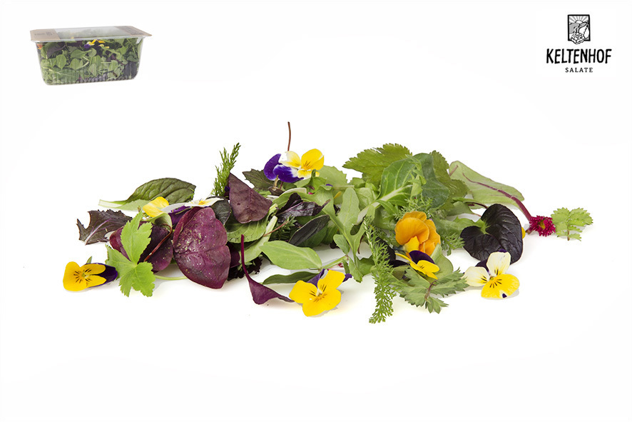 Die jungen, zarten Kräuter harmonieren perfekt mit den aromatischen Baby Leafs. Dekorative Blüten von Veilchen, Stiefmütterchen, Sauerklee und Ringelblüten bereichern den farbenfrohen Mix. Je nach Saison können auch andere Blüten zum Einsatz kommen. Ob mit Garnelen und Ingwer oder mit Lammmedaillons oder gegrilltem Ziegenkäse - der Salat sieht immer gut aus.