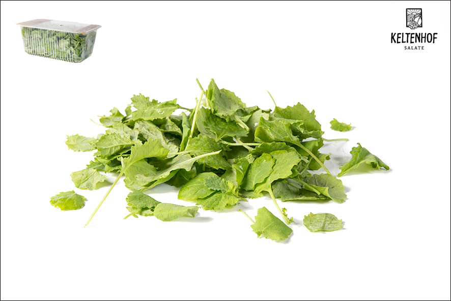 Der knackige Asiasalat ist eine japanische Züchtung und stammt von kohlverwandten Arten wie Chinakohl oder Pak Choi ab. Die ganz jung geernteten Blättchen sind etwa 4 bis 5 cm hoch. Die Blättchen sind hellgrün gezahnt mit weißen Blattadern. Sie enthalten die Vitamine A, B und C, wertvolle Folsäure und viele Mineralstoffe.