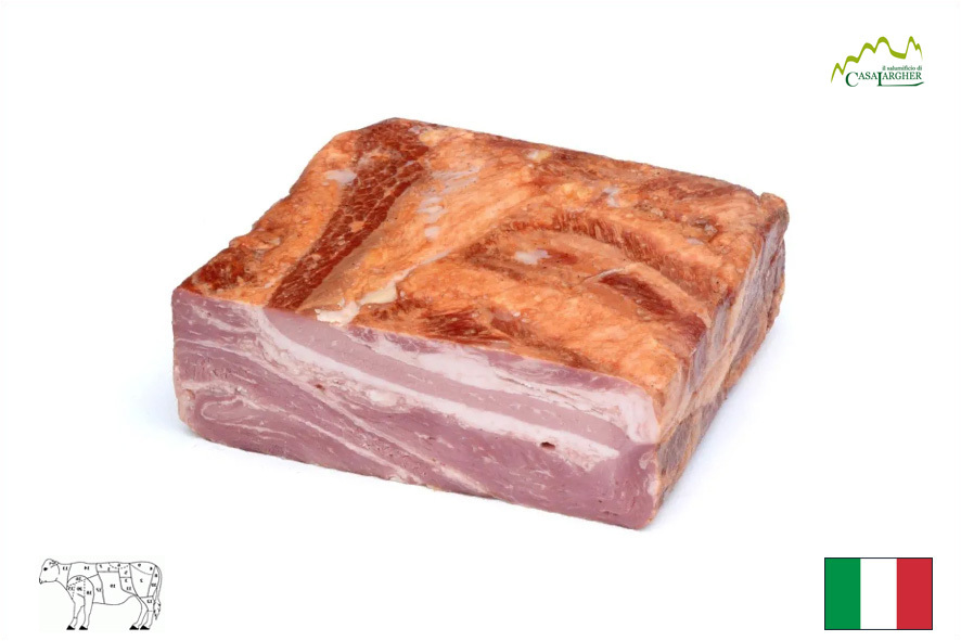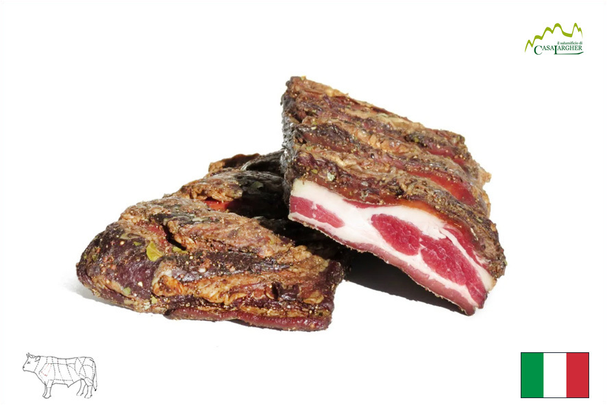 Als Alternative zum klassischen Bauchspeck vom Schwein, ist dieser vom Rind hergestellt. Handwerkliche Herstellung und leicht gewürzt und geräuchert. Ideal für die Zubereitung von Nudelgerichten wie "Alla Carbonara" oder "All'Amatriciana".